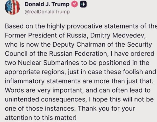 স্যন্দন ডিজিটেল ডেস্ক, ০২ অগস্ট : পরমাণু যুদ্ধ লাগল বলে! গোটা বিশ্বের উপর আমেরিকা সাম্প্রতিক শুল্কচাপ এবার বদলে যেতে পারে পরমাণু লড়াইয়ে। যার দুই প্রতিপক্ষ বরাবরের যুযুধান আমেরিকা-রাশিয়া। শুক্রবার রাশিয়ার উদ্দেশে সোশাল মিডিয়ায় মার্কিন প্রেসিডেন্ট ডোনাল্ড ট্রাম্পের হুঁশিয়ারি, ”রাশিয়া অত্যন্ত উসকানিূলক কথা বলছে। মনে রাখতে হবে, শব্দ খুব গুরুত্বপূর্ণ। তার জেরে যেন কোনও ফল ভুগতে না হয় রাশিয়াকে। তবে সেখানকার প্রাক্তন প্রেসিডেন্ট দিমিত্রি মেদভেদেভ, যিনি এখনও নিজেকে প্রেসিডেন্ট বলে মনে করেন, তাঁর মন্তব্যের পর আমি সঠিক স্থানে পরমাণু বোমা বহনে সক্ষম দুটি সাবমেরিন মোতায়েনের নির্দেশ দিয়েছি।”