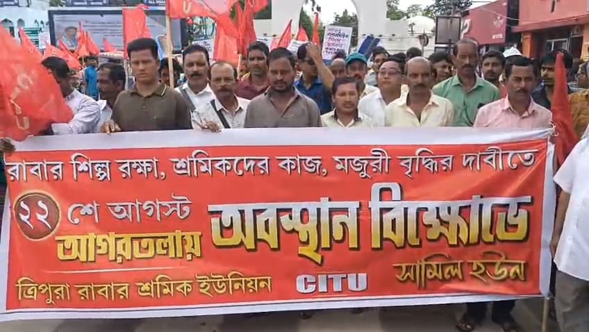স্যন্দন ডিজিটাল ডেস্ক, আগরতলা। ২২ আগষ্ট: রাবার শিল্প রক্ষা করা, শ্রমিকদের কাজ, মজুরি বৃদ্ধির দাবিতে ত্রিপুরা রাবার শ্রমিক ইউনিয়নের পক্ষ থেকে এক বিক্ষোভ মিছিল সংঘটিত করা হয় শুক্রবার। মিছিল শেষে সার্কেট হাউজ এলাকায় এক গণঅবস্থানের আয়োজন করা হয়। উপস্থিত ছিলেন সিআইটিইউ রাজ্য সভাপতি মানিক দে, সাধারণ সম্পাদক শংকর প্রসাদ দত্ত সহ অন্যান্য নেতৃত্ব।