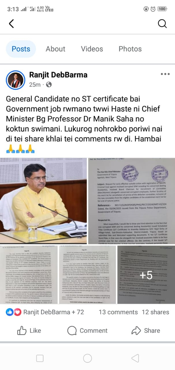 স্যন্দন ডিজিটাল ডেস্ক, আগরতলা। ২৩ আগস্ট : ত্রিপুরা পুলিশে কনস্টেবল নিয়োগ প্রক্রিয়ায় ব্যাপক দুর্নীতির অভিযোগ তুলে সরব হলেন রামচন্দ্রঘাট বিধানসভা কেন্দ্রের বিধায়ক রঞ্জিত দেববর্মা। জাল তপশিলি উপজাতি সার্টিফিকেট ব্যবহার করে এক সাধারণ প্রার্থীকে নিয়ম বহির্ভূতভাবে চাকরি পাইয়ে দেওয়া হয়েছে বলে অভিযোগ করে মুখ্যমন্ত্রী অধ্যাপক ডাঃ মানিক সাহাকে চিঠি দিয়েছেন। এই চিঠি তাঁর সোশ্যাল মিডিয়া পোস্ট প্রকাশ্যে আসতেই রাজ্য রাজনীতিতে তীব্র চাঞ্চল্য ছড়িয়েছে।