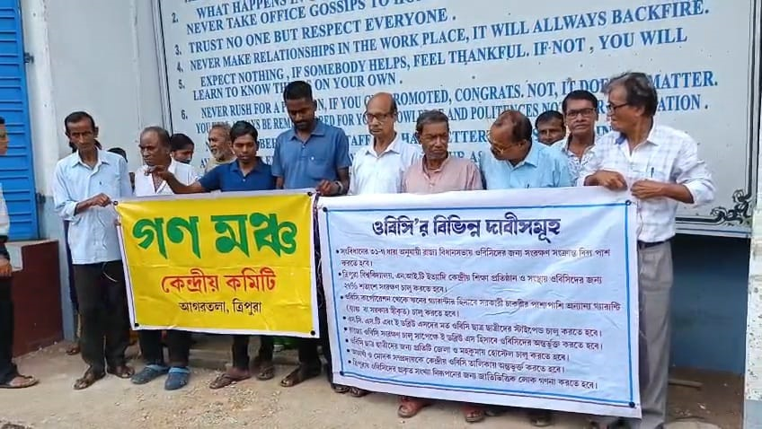 ত্রিপুরা বিশ্ববিদ্যালয়, এন.আই.টি ইত্যাদি কেন্দ্রীয় শিক্ষা প্রতিষ্ঠানে ওবিসিদের জন্য ২৭ শতাংশ সংরক্ষন চালু করতে হবে। ওবিসি কর্পোরেশন থেকে ঋনের গ্যারান্টার হিসাবে সরকারী চাকরির পাশাপাশি অন্যান্য গ্যারান্টি চালু করতে হবে। এস.সি, এস.টি এবং ই ডব্লিউ এস -দের মত ওবিসি ছাত্র ছাত্রীদের স্টাইপেন্ড চালু করতে হবে। রাজ্যে ওবিসি সংরক্ষন চালু সাপেক্ষে ই ডব্লিউ এস হিসাবে ওবিসিদের অন্তর্ভুক্ত করতে হবে। ওবিসি ছাত্র-ছাত্রীদের জন্য প্রতিটি জেলা ও মহকুমায় হোস্টেল চালু করার দাবি তোলা হয়েছে। আচার্য্য ও মোদক সম্প্রদায়কে কেন্দ্রীয় ওবিসি তালিকায় অন্তর্ভুক্ত করতে হবে। ত্রিপুরায় ওবিসিদের প্রকৃত সংখ্যা নিরূপনের জন্য জাতি ভিত্তিক লোক গণনা করা। আগামী দু- তিন মাসের ভেতর দাবিগুলি পূরণ না হলে বৃহত্তর আন্দোলনে যাবে বলে জানান তারা।