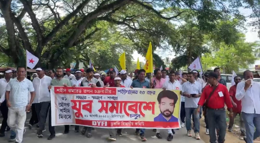 স্যন্দন ডিজিটাল ডেস্ক, আগরতলা। ৩১ আগস্ট : রবিবার ডি ওয়াই এফ আই ও টি ওয়াই এফ তেলিয়ামুড়া বিভাগীয় কমিটির উদ্যোগে ভারতীয় যুব ফেডারেশনের যুব নেতা তপন চক্রবর্তীর ২৬ তম শহীদান দিবস পালন করা হয়। অনুষ্ঠানে উপস্থিত ছিলেন প্রাক্তন মুখ্যমন্ত্রী মানিক সরকার, রাজ্যের বিরোধী দলনেতা জিতেন্দ্র চৌধুরী, খোয়াই বিধান সভার বিধায়ক নির্মল বিশ্বাস, প্রাক্তন বিধায়ক পবিত্র কর সহ অন্যান্যরা। প্রতিবছরের ন্যায় এই বছরও সিপিআইএম তেলিয়ামুড়া বিভাগীয় কার্যালয়ের সামনে সংগঠনের পতাকা উত্তোলন এবং তপন চক্রবর্তীর শহীদ বেদিতে পুষ্পস্তবক ও মাল্যদান করেন নেতৃত্ব। প্রাক্তন মুখ্যমন্ত্রী মানিক সরকার বক্তব্য রেখে বলেন, ২০০০ সালের এই দিনে প্রয়াতঃ তপন চক্রবর্তী ও সহকর্মীদের নিয়ে কল্যাণপুর এলাকার বাগান বাজারের শান্তিনগর এলাকা থেকে শান্তি সভা করে ফিরে আসার পথে খোয়াই নদীর খেয়া ঘাটে আততায়ীর গুলিতে নিহত হন যুব নেতা তপন চক্রবর্তী।