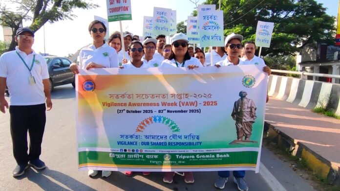 মঙ্গলবার আগরতলা শহরে একটি সচেতন মূলক মিছিলের আয়োজন করা হয়। অভয়নগর শাখার সামনে থেকে শুরু হয় এই মিছিল। উপস্থিত গ্রামীণ ব্যাংকের জেনারেল ম্যানেজার অনুপ কুমার সাহা জানান, দুর্নীতি একটা দেশকে পঙ্গু করে দিতে পারে। তাই দুর্নীতি মুক্ত ভারত গড়তে সংকল্প নিয়েছে ত্রিপুরা গ্রামীণ ব্যাংক। এই উদ্দেশ্য নিয়ে আগামী ২ নভেম্বর পর্যন্ত চলবে কর্মসূচি। রাজ্যের বিভিন্ন বিদ্যালয় এবং মহাবিদ্যালয়ে এই সচেতনমূলক কর্মসূচি করা হবে বলে জানান তারা।