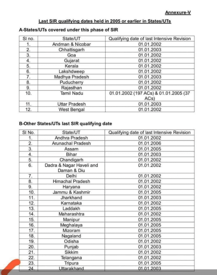 স্যন্দন ডিজিটাল ডেস্ক, আগরতলা। ১২ নভেম্বর : এস.আই.আর অর্থাৎ ভোটার তালিকায় নিবিড় সংশোধনীর ক্ষেত্রে পয়লা জানুয়ারি ২০০৫ তারিখকে ভিত্তি ধরে যাবতীয় নথিপত্র গ্রহন করা হবে। সরকারিভাবে এই নির্দেশ জারি করা হয়েছে। দুটি ভাগে ভাগ করা হয়েছে এস আই আর -এর তালিকায় বিভিন্ন রাজ্যকে। ত্রিপুরা দ্বিতীয় ভাগে রয়েছে। ইতিমধ্যে ত্রিপুরা নির্বাচন দপ্তর থেকে শুরু হয়েছে দৌড়ঝাপ। সমস্ত রকম প্রস্তুতি সেরে নেওয়া হচ্ছে বলে প্রশাসন সূত্রে খবর। এস.আই.আর -এর জন্য গুরুত্বপূর্ণ ভূমিকা পালন করবেন বিএলও -রা।