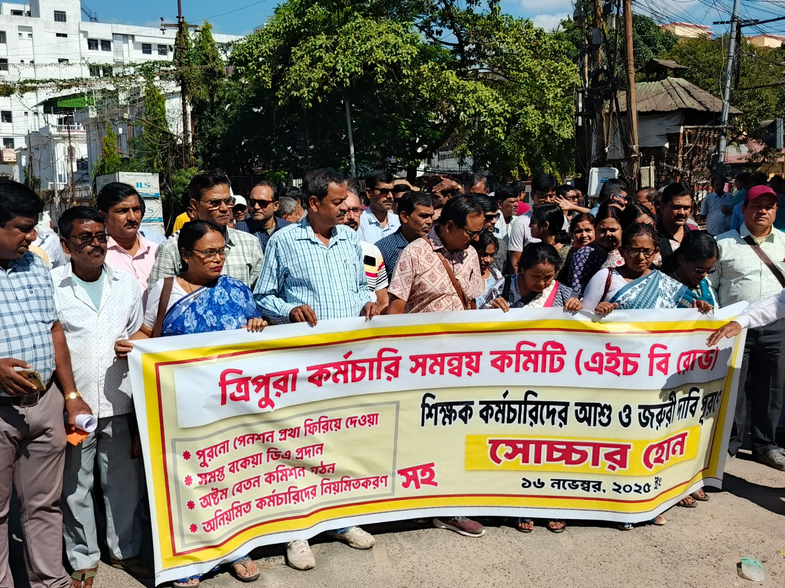 স্যন্দন ডিজিটাল ডেস্ক, আগরতলা। ১৬ নভেম্বর :পুলিশ প্রশাসনের নির্দেশিকাকে বুড়ো আঙ্গুল দেখিয়ে আগরতলা শহরে ১১ দফা দাবিতে বিক্ষোভ কর্মসূচি সংঘটিত করল ত্রিপুরা সরকারি কর্মচারী সমন্বয় কমিটি। এর মধ্যে দিয়ে সরকারি কর্মচারীদের সংগঠন প্রশাসনিক নির্দেশকে কলাপাতা বানিয়ে দিয়েছে। জানা যায়, ত্রিপুরা সরকারি কর্মচারী সমন্বয় কমিটির উদ্যোগে আগরতলা শহরে মিছিল ও গণঅবস্থানের অনুমতি চাইলে প্রশাসন অনুমতি না দেওয়ায় প্যারাডাইস চৌমুহনীতে বিক্ষোভ সামিল হয় রবিবার।