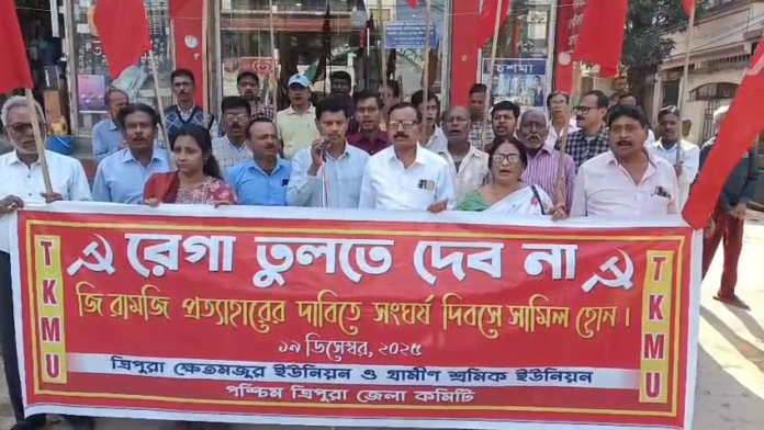 স্যন্দন ডিজিটাল ডেস্ক, আগরতলা। ১৯ ডিসেম্বর :  জি রামজি প্রত্যাহারের দাবিতে সংঘর্ষ দিবসে সামিল হতে আহবান জানিয়ে ময়দানে সরব হল ত্রিপুরা ক্ষেতমজুর ইউনিয়ন ও গ্রামীণ শ্রমিক ইউনিয়নের পশ্চিম ত্রিপুরা জেলা কমিটি। শুক্রবার আগরতলা শহরে একটি বিক্ষোভ মিছিল সংঘটিত করা হয়। মিছিলটি শহরের বিভিন্ন পথ পরিক্রমা করে রাজধানীর সিটি সেন্টারের সামনে এসে শেষ হয়ে সেখানে একটি সভার আয়োজন করা হয়। উপস্থিত ছিলেন ত্রিপুরা ক্ষেতমজুর ইউনিয়নের সম্পাদক শ্যামল দে।