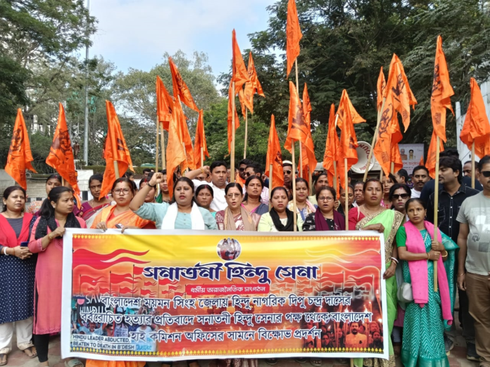 স্যন্দন ডিজিটাল ডেস্ক, আগরতলা, ২০ ডিসেম্বর : গত কয়েকদিন ধরে উত্তপ্ত বাংলাদেশ। সংখ্যালঘু থেকে শুরু করে সাধারণ মানুষকে প্রান হারাতে হচ্ছে আন্দোলনকারীদের দ্বারা। বাংলাদেশের ময়মন সিংহ জেলায় বিপুল দাসকে জীবন্ত পুড়িয়ে মেরেছে সে দেশের মৌলবাদী কট্টরপন্থীরা। এরই প্রতিবাদে শনিবার সনাতনী হিন্দু সমাজ আগরতলা স্থিত বাংলাদেশের সহকারি হাইকমিশনারের কার্যালয়ের সামনে বিক্ষোভ প্রদর্শন করে।