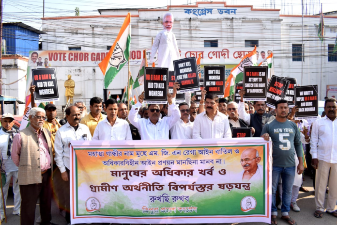 সদর জেলা কংগ্রেসের সভাপতি সহ অন্যান্যরা। মিছিলটি আগরতলা শহরের বিভিন্ন রাস্তা পরিক্রমা করে। মিছিল শেষে প্রধানমন্ত্রী নরেন্দ্র মোদীর কুশ পুত্তলিকা পুড়ানো হয়। প্রদেশ কংগ্রেসের মুখপাত্র প্রবীর চক্রবর্তী সংবাদ মাধ্যমের মুখোমুখি হয়ে এইদিনের মিছিলের বিষয়ে জানান। পাশাপাশি তিনি কেন্দ্রীয় সরকারের তীব্র সমালোচনা করেন। এদিকে কংগ্রেস বিধায়ক সুদীপ রায় বর্মন বলেন, জি রাম জি বিল এনে মহাত্মা গান্ধীকে চরমভাবে অপমানিত করেছে কেন্দ্রীয় সরকার। তারা চাইছে মহাত্মা গান্ধীর নাম যাতে না রাখা যায়। তাদের নাথুরাম গডসে মহাত্মা গান্ধীকে হত্যা করেছিল। তাই বিল সামনে আনতে চাইছে সরকার। পার্লামেন্টের ভেতরে এবং বাইরে এর তীব্র প্রতিবাদ জানানোর সিদ্ধান্ত নিয়েছে কংগ্রেস। তিনি বলেন বছরে ১২৫ দিনের কাজের প্রতিশ্রুতি দিয়েছিল সরকার। অথচ সেই প্রতিশ্রুতি পালন করছে না বলে জানান তিনি।