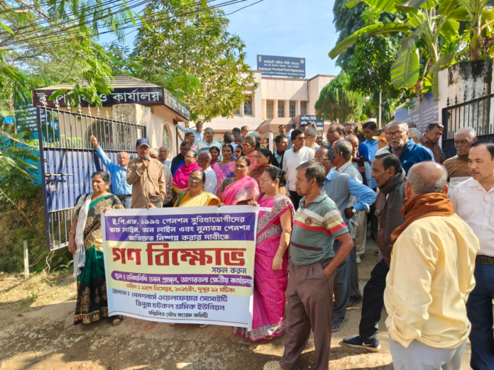 স্যন্দন ডিজিটাল ডেস্ক, আগরতলা। ২২ ডিসেম্বর : সোমবার পেনশনার্স ওয়েলফেয়ার সোসাইটি ও ত্রিপুরা চটকল শ্রমিক ইউনিয়ন সম্মিলিত যৌথ সংগ্রাম কমিটির উদ্যোগে গন বিক্ষোভ কর্মসূচি অনুষ্ঠিত হয়। ভবিষ্যনিধি ভবন প্রাঙ্গণে এই গন বিক্ষোভ কর্মসূচি সংগঠিত করা হয়। ই.পি.এফ ১৯৯৫ পেনশন সুবিধাভোগীদের অফ লাইন, অন লাইন এবং নুন্যতম পেনশন অতিদ্রুত নিষ্পন্ন করার দাবীতে এই গণ বিক্ষোভ কর্মসূচি পালন করা হয়। এইদিনের বিক্ষোভ কর্মসূচিতে উপস্থিত ছিলেন ত্রিপুরা চটকল শ্রমিক ইউনিয়নের নেতৃত্ব ধনমনি সিং।