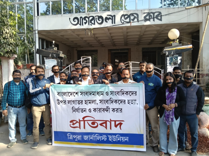 সম্প্রতি বাংলাদেশে যে ভাবে সংবাদ মাধ্যমের অফিসে আগুন দেওয়া হয়েছে, সাংবাদিকদের উপর আক্রমণ করা হয়েছে তার প্রতিবাদে এইদিন ত্রিপুরা জার্নালিস্ট ইউনিয়ন মৌন প্রতীবাদ কর্মসূচি পালন করা হচ্ছে। কালো ব্যাচ ধারন করে এইদিন মৌন প্রতীবাদ কর্মসূচি পালন করা হচ্ছে। একই সাথে বাংলাদেশকে বার্তা দেওয়া হচ্ছে যে সকল সাংবাদিক বন্ধি রয়েছে তাদেরকে অবিলম্বে মুক্তি দেওয়া হোক। যে দুইটি সংবাদ মাধ্যমের অফিস পুড়িয়ে দেওয়া হয়েছে, সেই দুইটি অফিস যেন পুনঃনির্মাণ করে দেওয়া হয়। আরো বলেন, সাংবাদিকরা যেন নিরাপত্তার সাথে স্বাধীন ভাবে কাজ করতে পারে তার ব্যবস্থা করে দেওয়া হোক। এদিকে সোমবার দুপুরে খোয়াই জেলাশাসক রজত পন্থের মাধ্যমে রাষ্ট্রপতির উদ্দেশ্যে স্মারকলিপি প্রদান খোয়াই প্রেস ক্লাব এবং ত্রিপুরা ওয়ার্কিং জার্নালিস্ট অ্যাসোসিয়েশনের এক প্রতিনিধি দলের উদ্যোগে। এই স্মারক লিপি প্রদান কালে উপস্থিত ছিলেন প্রেসক্লাবের সম্পাদক শুভঙ্কর দে সহ অন্যান্যরা।
