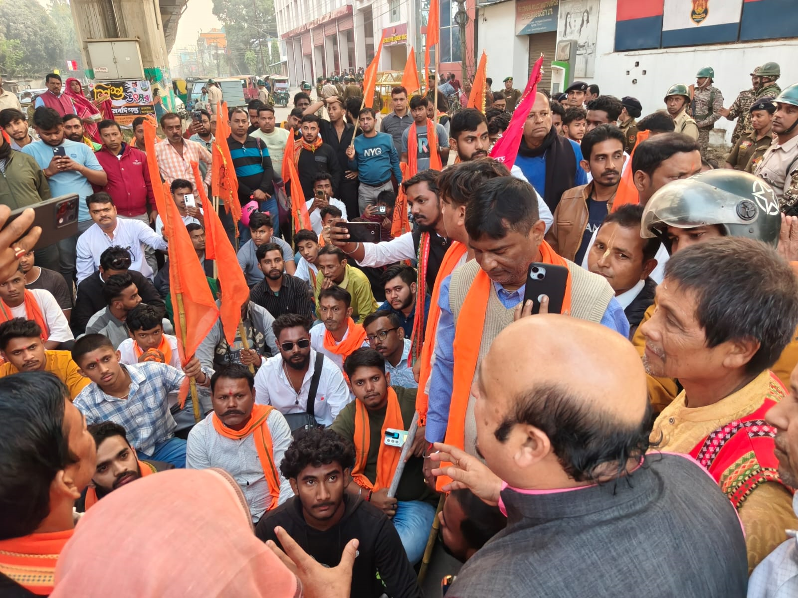 সেখানে পুলিশের সাথে বিশ্ব হিন্দু পরিষদ ও বজরং দলের কর্মী সমর্থকদের মধ্যে ধস্তাধস্তি হয়। একটা সময়ের পর পুলিশের বেরিকেট ভেঙে ফেলে আন্দোলনকারীরা। তারপর আখাউড়া সীমান্তের দিকে এগিয়ে যেতে চায় তারা। তারপর পুলিশ এবং কেন্দ্রীয় আধা সামরিক বাহিনীর যৌথ প্রচেষ্টায় পরিস্থিতি নিয়ন্ত্রণে আসে। সংগঠনের নেতৃত্ব জানান বাংলাদেশে অন্তর্বর্তী সরকার প্রতিষ্ঠার পর থেকে সেই দেশে সংখ্যা লঘুদের উপর আক্রমণ করা হচ্ছে। দিনের পর দিন সেই দেশে সংখ্যা লঘুদের উপর আক্রমণ বৃদ্ধি পাচ্ছে। সম্প্রতি দিপু দাস নামে এক যুবককে নির্মম ভাবে হত্যা করা হয়েছে। এই সকল ঘটনার প্রতিবাদে এইদিন রাজধানীতে প্রতীবাদ মিছিল সংগঠিত করা হয়েছে। তবে এদিনের মিছিল থেকে অগ্নিগর্ভ বাংলাদেশকে করা হুশিয়ারি দিয়ে সতর্ক করা হয়েছে। এবং এই আন্দোলন শুধু আগরতলায় নয়, গোটা দেশে ছড়িয়ে পড়ছে।