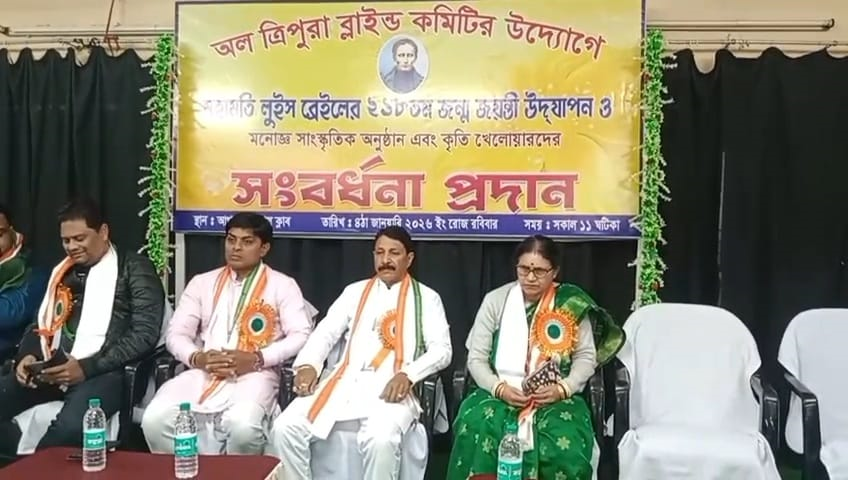 স্যন্দন ডিজিটাল ডেস্ক, আগরতলা। ৪ জানুয়ারি : অল ত্রিপুরা ব্লাইন্ড কমিটির উদ্যোগে মহামতি লুইস ব্রেইলের ২১৮ তম জন্ম জয়ন্তী উদযাপন উপলক্ষে আগরতলা প্রেস ক্লাবে এক সাংস্কৃতিক অনুষ্ঠান ও কৃতি খেলোয়ারদের সংবর্ধনা জানানোর আয়োজন করা হয়। উপস্থিত ছিলেন সংগঠনের সাধারণ সম্পাদক সঞ্জয় ধন ভৌমিক।