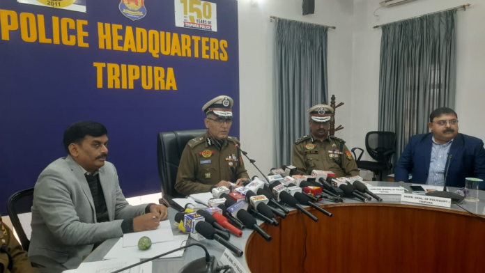 তার মধ্যে বাংলাদেশী ৩৯৩ জন, রোহিঙ্গা ১২ জন এবং অন্যান্য নাগরিক ৬০ জন। সাংবাদিক সম্মেলনে রাজ্য পুলিশের মহা নির্দেশককে সাংবাদিকরা প্রশ্ন করলেন, ত্রিপুরার সীমান্ত ঘেঁষা পার্শ্ববর্তী বাংলাদেশে ভারত বিদ্বেষী মনোভাব বাড়ছে। গত কয়েক মাসে বাংলাদেশী ড্রোন উদ্ধার হয়েছে ত্রিপুরার সীমান্ত ঘেঁষা বিভিন্ন গ্রাম থেকে। তারপর রাজ্য পুলিশের পক্ষ থেকে কি ভূমিকা নেওয়া হয়েছে রাজ্যবাসীর সুরক্ষার্থে। এর উত্তরে রাজ্য পুলিশের মহা নির্দেশক জানান, ড্রোন উদ্ধারের পর পরীক্ষার জন্য পাঠানো হয়েছে। পাশাপাশি ত্রিপুরাবাসী পুরোপুরি নিরাপদ। কোন ধরনের ঝুঁকি নেই রাজ্যবাসীর। সীমান্ত রক্ষীদের সঙ্গে এবং গোয়েন্দা শাখার সঙ্গে যোগাযোগ রেখে ত্রিপুরা পুলিশ রাজ্যবাসীর পুরোপুরি নিরাপত্তা বজায় রাখছে। কোন চিন্তার কারণ নেই। একই সঙ্গে সাংবাদিক সম্মেলনে তিনি বলেন, দুর্ঘটনা রুখতে ট্রাফিক প্রশাসনের পক্ষ থেকে কড়া পদক্ষেপ নেওয়া হচ্ছে। জরিমানা এবং মামলা নেওয়া হচ্ছে বেআইনিভাবে গাড়ি বাইক চালানোর জন্য। ২০২৫ সালে বেআইনিভাবে গাড়ি চালানো এবং বাইক চালানোর কারণে জরিমানার হার বেড়েছে ১৬ শতাংশ। মোট জরিমানা হয়েছে কুড়ি কোটি দুই লক্ষ টাকা। বিশেষ করে যেসব নাবালক রাস্তায় গাড়ি কিংবা বাইক চালাচ্ছে তাদের আটক করে কড়া পদক্ষেপ নেওয়া হচ্ছে। এদিনের সাংবাদিক সম্মেলনে রাজ্য পুলিশের অন্যান্য আধিকারিক উপস্থিত ছিলেন।