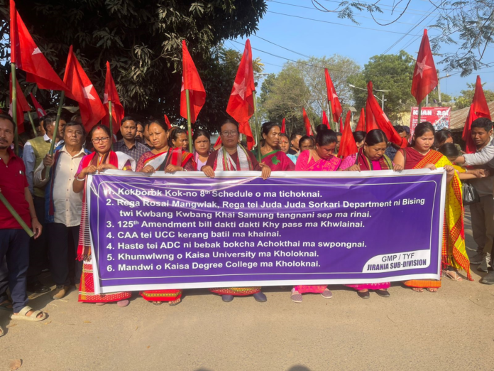 স্যন্দন ডিজিটাল ডেস্ক, আগরতলা। ১৮ জানুয়ারি : ককবরক ভাষাকে অষ্টম তপশিলি অন্তর্ভুক্ত করা, সিএএ বাতিল করা, মনরেগা বাতিল প্রত্যাহার করা, টিটিএএডিসি-র শূন্যপদ পূরণ করা সহ একাধিক দাবিতে টিটিএএডিসি-র প্রাক্তন মুখ্য কার্যনির্বাহী সদস্য তথা জি এম পি রাজ্য সম্পাদক রাঁধাচরণ দেববর্মার নেতৃত্বে মান্দাইয়ে সিপিআইএম -এর বিক্ষোভ মিছিল অনুষ্ঠিত হয়। প্রতিবাদ মিছিল থেকে সংবাদ মাধ্যমের মুখোমুখি হয়ে রাঁধাচরণ দেববর্মা বলেন, ককবরক ভাষাকে সংবিধানের অষ্টম তপশিলি অন্তর্ভুক্ত করার দাবি জানানো হচ্ছে।