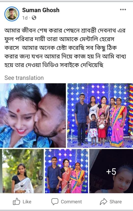 এদিকে মৃত যুবকের পরিবার এই ঘটনার জন্য সংশ্লিষ্ট যুবতীকে দায়ী করে কঠোর শাস্তির দাবি জানিয়েছে। পরিবারের বক্তব্য, মানসিক নির্যাতনের ফলেই এই চরম সিদ্ধান্ত নিতে বাধ্য হয়েছে সুমন ঘোষ। এমনকি আত্মহত্যার আগে সমান সামাজিক মাধ্যমে প্রেমিকার ছবির সঙ্গে তার ছবি পোস্ট করে লিখেছেন মানসিক নির্যাতনের কারণে সে এই পথ বেছে নিচ্ছে। এর জন্য দায়ী তার প্রেমিকা শ্রাবন্তির পরিবার। অন্যদিকে, ঘটনার তদন্তে নেমেছে রাধাকিশোরপুর থানার পুলিশ। পুলিশ সূত্রে জানা গেছে, সমস্ত দিক খতিয়ে দেখা হচ্ছে এবং ময়না তদন্তের রিপোর্ট পাওয়ার পর পরবর্তী আইনগত পদক্ষেপ নেওয়া হবে।