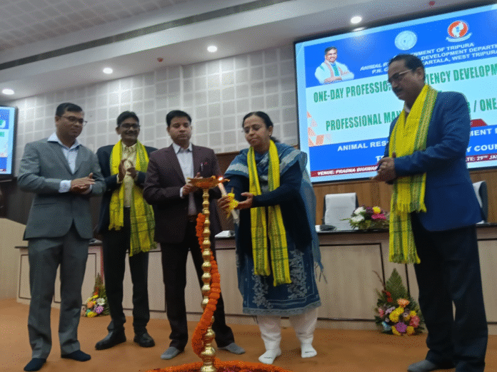 স্যন্দন ডিজিটাল ডেস্ক, আগরতলা। ২৯ জানুয়ারি: বৃহস্পতিবার আগরতলার প্রজ্ঞা ভবনে “ভেটেরিনারি, প্রাণী পালন ও দুগ্ধ ব্যবস্থায় পেশাদার ব্যবস্থাপনা” শীর্ষক একটি রাজ্যস্তরীয় এক কর্মশালা অনুষ্ঠিত হয়। এই কর্মশালায় ভেটেরিনারি ও সংশ্লিষ্ট খাতে পেশাদার দক্ষতা এবং আধুনিক ব্যবস্থাপনা পদ্ধতি জোরদার করার ক্ষেত্রে একটি গুরুত্বপূর্ণ পদক্ষেপ হিসেবে বিবেচিত হয়েছে। কর্মশালায় উদ্বোধক হিসেবে উপস্থিত ছিলেন প্রাণিসম্পদ বিকাশ দপ্তর ও মৎস্য তপশিলি জাতি কল্যাণ দপ্তরের সচিব দীপা ডি. নায়ার, তাছাড়া উপস্থিত ছিলেন অধিকর্তা এ আর ডিডির অধিকর্তা এন কে চঞ্চল, এডিশনাল ডাইরেক্টর তথা প্রেসিডেন্ট ত্রিপুরা ভেটেনারি কাউন্সিল বিমল কৃষ্ণ দাস।