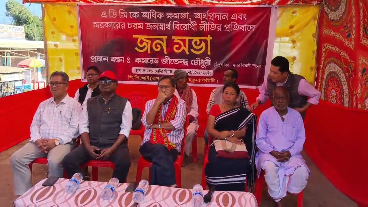 এইদিনের জনসভায় বক্তব্য রাখতে গিয়ে জিতেন্দ্র চৌধুরী তিপ্রা মথা ও বিজেপির তীব্র সমালোচনা করেন। তিনি বলেন তিপ্রা মথা, রাজ্য সরকার ও কেন্দ্রীয় সরকারের মধ্যে ত্রি-পাক্ষিক চুক্তি হয়েছে। সেই চুক্তি নিয়ে তিপ্রা মথা অনেক প্রচার করেছে। কিন্তু সেই চুক্তিতে গ্রেটার তিপ্রাল্যান্ড কিংবা তিপ্রাল্যাণ্ড নিয়ে কোন কিছু উল্লেখ নেই। তিনি আরও বলেন তিনি সাংসদ তাকাকালীন সময় সংবিধানের ১২৫ তম সংশোধনীর জন্য একটি বিল আসে। সেই বিলটি পাশ হয় নি। যদি এই বিলটি পাশ হতো তাহলে এডিসি বর্তমানে আগের থেকে দ্বিগুণ অর্থ পেত বিভিন্ন দপ্তর থেকে।