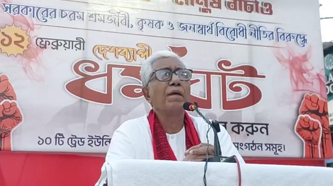 তখনই শাসকদলের বিরুদ্ধে ধর্মঘটের ডাক দিতে হয়। দেশের কৃষক শ্রমিক বাধ্য হয়েছে ১২ ফেব্রুয়ারি ধর্মঘটে যেতে। কারণ বর্তমান সরকার শ্রমকোড কার্যকর করে মালিক স্বার্থ রক্ষা করার চেষ্টা করছে। শ্রমিকদের দৈনিক ৮ ঘণ্টার কাজের অধিকার হরণ করার চেষ্টা করে ১০-১৫ ঘন্টার দৈনিক কাজ চাপিয়ে দেওয়ার চেষ্টা করছে। একই সঙ্গে শ্রমিকরা অতিরিক্ত কাজের অতিরিক্ত মজুরি পর্যন্ত কেড়ে নিচ্ছে সরকার। পাশাপাশি মজুরি নিয়ে মালিকদের সঙ্গে শ্রমিকের দরকষাকষির সুযোগ পর্যন্ত কেড়ে নেওয়ার জন্য এই শ্রমকোড কার্যকর করতে চাইছে। তাই এই পরিস্থিতিতে শ্রমিকদের সামনে আর কোন বিকল্প পথ নেই। তাই আক্রান্ত ও বিপর্যস্ত হয়ে শ্রমিকদের প্রত্যাঘাট করতে রাস্তায় নামতে হবে। প্রাক্তন মুখ্যমন্ত্রী সরকারকে কাঠগড়ায় তুলে আর বলেন, দেশ পরিচালনা করছে পুঁজিপতি এবং সাম্প্রদায়িক শক্তি। সরকার এক চিতিয়া পুঁজিপতিদের স্বার্থ রক্ষা করে চলছে। তাদের কর ছাড় দিয়ে চলেছে সরকার। অপরদিকে শ্রমিক কৃষকদের অধিকার হরণ করছে। একের পর এক আক্রমণ নামিয়ে এনে অস্বাভাবিক এবং অস্বস্তিকর পরিবেশ সৃষ্টি করছে।