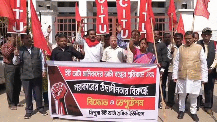 স্যন্দন ডিজিটাল ডেস্ক, আগরতলা। ১৮ ফেব্রুয়ারি :   কয়লা সংকটের কারণে ইট ভাট্টার কাজ বন্ধের প্রতিবাদে এবং সরকারের উদাসীনতার বিরুদ্ধে শ্রম দপ্তরের সামনে বিক্ষোভ দেখায় সি আই টি ইউ অনুমোদিত ত্রিপুরা ইট ভাট্টা শ্রমিক ইউনিয়নের কর্মকর্তারা। পরে শ্রম দপ্তরে একটি ডেপুটেশন প্রদান করেন তারা। ডেপুটেশনের পর সংগঠনের নেতা তথা সিআইটিইউ-র সাধারণ সম্পাদক শংকর প্রসাদ দত্ত বক্তব্য রাখতে গিয়ে দাবি করেন, রাজ্যের কোন সরকার আছে বলে অনুভব করতে পারছেন না।