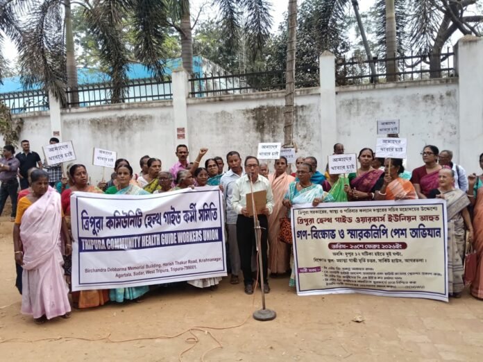 স্যন্দন ডিজিটাল ডেস্ক, আগরতলা। ২৩ ফেব্রুয়ারি :ত্রিপুরা কমিউনিটি হেলথ গাইড ওয়ার্কার্স ইউনিয়নের পক্ষ থেকে সোমবার বিক্ষোভ কর্মসূচি সংঘটিত করা হয়। ত্রিপুরা কমিউনিটি হেলথ গাইডদের ছাটাই করার প্রতিবাদে এদিন সার্কিট হাউস এলাকায় বিক্ষোভ প্রদর্শন করেন তারা। তাদের বক্তব্য, তারা বাড়ি বাড়িতে স্বাস্থ্য পরিষেবা পৌছে দিত তাদের নিয়োজিত ছিল। কিন্তু স্বাস্থ্য ও পরিবার কল্যান দপ্তরের সচিব গত ১লা নভেম্বর এক আদেশ মূলে তাদের ছাটাই করে দেন।
