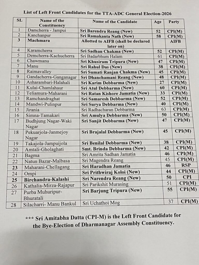 টিটিএএডিসি এবং উপনির্বাচনের জন্য অগ্রিম প্রার্থী তালিকা ঘোষণা করে চমক দিল বামফ্রন্ট