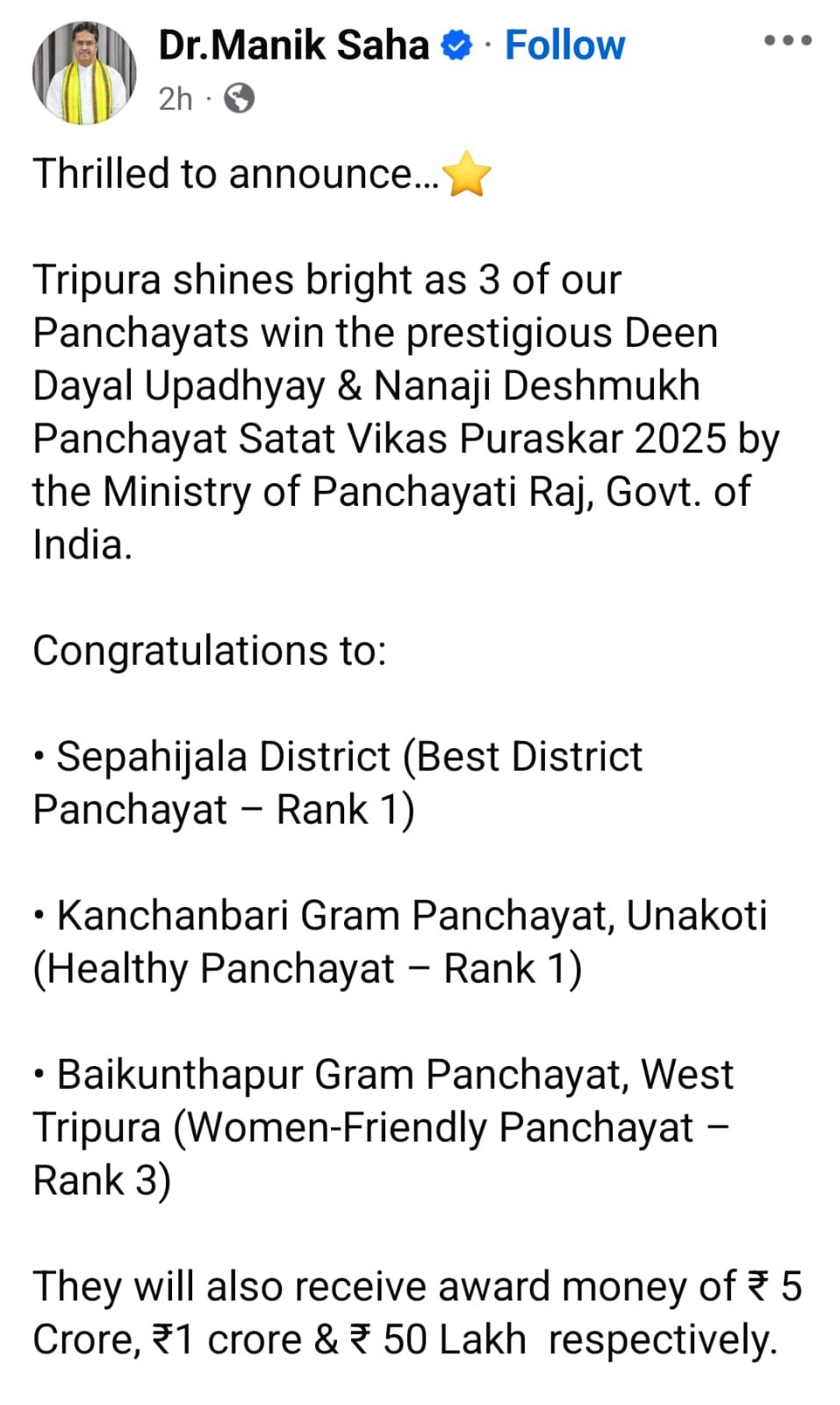 মুখ্যমন্ত্রী জানান ত্রিপুরা দীনদয়াল উপাধ্যায় এবং নানাজি দেশমুখ পঞ্চায়েত সতত বিকাশ পুরস্কার পেয়েছে সিপাহীজলা জেলার সেরা জেলা পঞ্চায়েত- র্যাঙ্ক-১-এর মর্যাদা পেয়েছে, কাঞ্চনবাড়ি গ্রাম পঞ্চায়েত, উনাকোটি স্বাস্থ্যকর পঞ্চায়েত – র্যাঙ্ক-১ -এর মর্যাদা পেয়েছে এবং বৈকুণ্ঠপুর গ্রাম পঞ্চায়েত, পশ্চিম ত্রিপুরা নারী-বান্ধব পঞ্চায়েত – র্যাঙ্ক-৩ -র মর্যাদা পেয়েছে। তারা যথাক্রমে ৫ কোটি, ১ কোটি এবং ৫০ লাখ টাকা পুরস্কারের অর্থও পাবে।