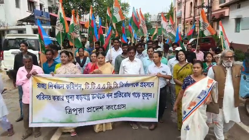 স্যন্দন ডিজিটাল ডেস্ক, আগরতলা। ৯ এপ্রিল : রাজ্য নির্বাচন কমিশন, টিটিএএডিসি নির্বাচনকে প্রহসনের পরিণত করার জন্য ঘৃন্য ষড়যন্ত্র রুখতে গণপ্রতিরোধ গড়ে তুলতে মাঠে নামলো প্রদেশ কংগ্রেস। বৃহস্পতিবার একটি মিছিল করে রাজ্য নির্বাচন আয়োগে যায় কংগ্রেসের প্রতিনিধি। নির্বাচন আয়োগ ঘেরাও করে তীব্র প্রতিবাদ জানান। প্রতিনিধি দলে নেতৃত্ব দেন প্রদেশ কংগ্রেসের মুখপাত্র প্রবীর চক্রবর্তী।