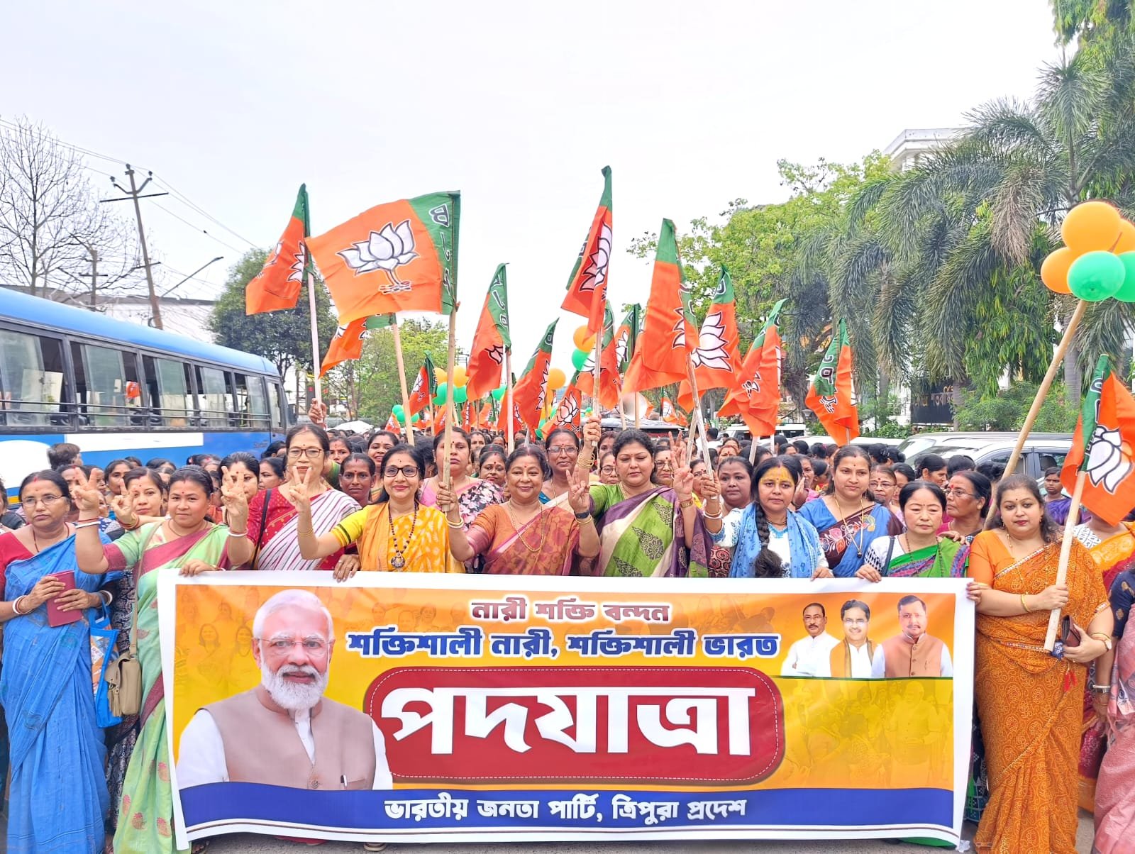 স্যন্দন ডিজিটাল ডেস্ক, আগরতলা। ১৬ এপ্রিল : বৃহস্পতিবার লোকসভার বিশেষ অধিবেশনে মহিলা সংরক্ষণ ‘নারী শক্তি বন্দন অধিনিয়ম’ অর্থাৎ মহিলাদের জন্য আসন সংরক্ষণ সংক্রান্ত সংশোধনী বিলটি উত্থাপন করা হয়। মহিলা সংরক্ষণ ও আসন পুনর্নির্ধারণ বিষয়ক বিশেষ সংসদ অধিবেশন চলাকালীন প্রধানমন্ত্রী এই বিল দেশের মহিলাদের স্বার্থ সংশ্লিষ্ট অত্যন্ত গুরুত্বপূর্ণ। এই বিলের সমর্থনে প্রদেশ বিজেপি-র পক্ষ থেকে বৃহস্পতিবার বিকেলে রাজধানীর রবীন্দ্র শতবার্ষিকী ভবনের সামনে থেকে এক মিছিল অনুষ্ঠিত হয়। মিছিলে উপস্থিত ছিলেন ত্রিপুরা বিধানসভার মুখ্য সচেতন কল্যাণী রায়, প্রদেশ মহিলা মোর্চার সভানেত্রী মিমি মজুমদার সহ অন্যান্যরা।