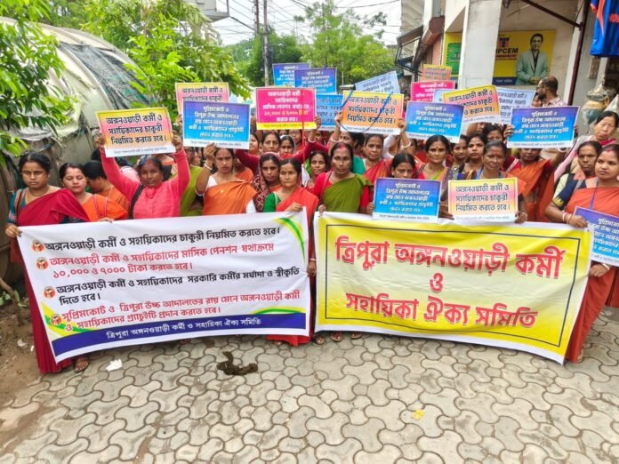 স্যন্দন ডিজিটাল ডেস্ক, আগরতলা। ২৮ এপ্রিল : অঙ্গনওয়াড়ি কর্মী সহায়িকাদের চাকরিতে সরকারি স্বীকৃতি প্রদান করে নিয়মিত করণ করা, উচ্চ আদালতের রায় অনুযায়ী গ্র্যাচুয়িটি প্রদান করা, মহার্ঘ ভাতা প্রদান করা সহ একাধিক দাবিতে সমাজ কল্যাণ ও সমাজ শিক্ষা দপ্তরের অধিকর্তার নিকট ডেপুটেশন প্রদান অঙ্গনওয়াড়ি কর্মী ও সহায়িকা ঐক্য সমিতির। ৯ দফা দাবি আদায়ের লক্ষ্যে এইদিন অঙ্গনওয়াড়ি কর্মী ও সহায়িকারা দপ্তরের অধিকর্তার কার্যালয়ে গিয়ে দপ্তরের অধিকর্তার হাতে স্মারক লিপি তুলে দেন।