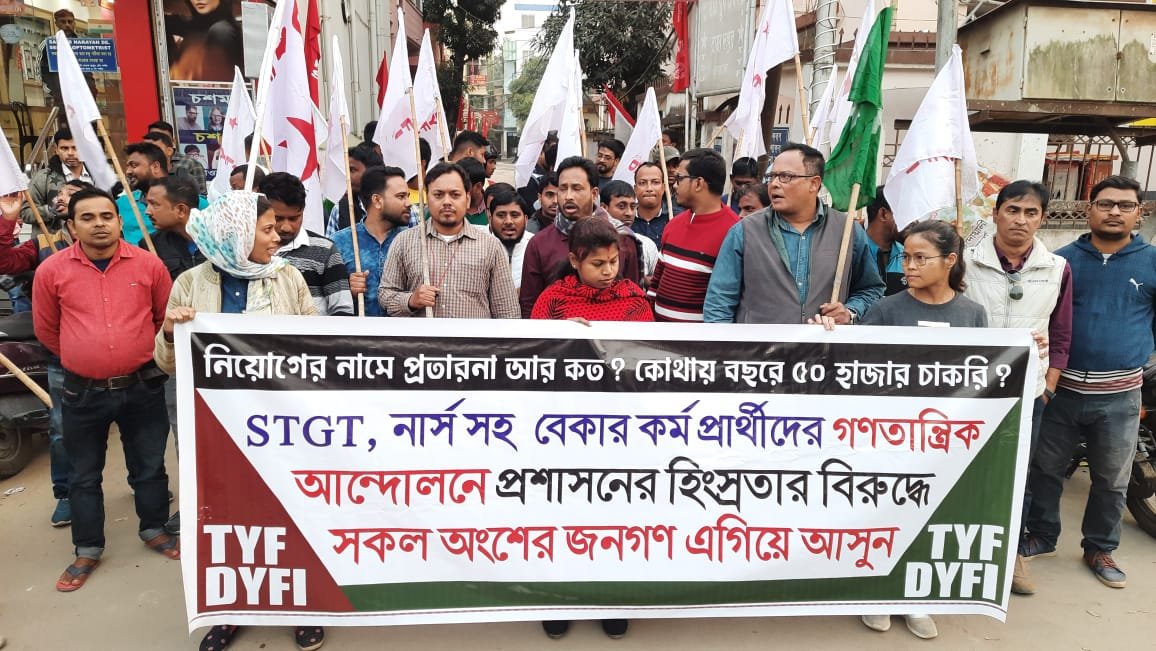 সোমবার একইভাবে এসটিজিটি উত্তীর্ণ যুবক-যুবতীদের উপর পুলিশ অমানবিকভাবে লাঠি পেটটা করেছে। সরকারের এ ধরনের রাষ্ট্রীয় সন্ত্রাসের তীব্র নিন্দা জানান ডিওয়াইএফআই এবং টি ওয়াই এফ। তিনি এদিন রাজ্যের শিক্ষামন্ত্রীর দুর্ব্যবহার নিয়ে তীব্র সমালোচনা করে বলেন এভাবে উচ্চশিক্ষিত যুবক-যুবতীদের সাথে কথা বলতে পারেন না। তিনি আরো বলেন, বর্তমান সরকারের আর মেয়াদ কয়েক দিন। আর এই সময়ের মধ্যে সরকার রাজ্যের বেকার যুবক যুবতীদের প্রত্যাশা পূরণ করতে পারবে না। তাই সকল যুবক-যুবতীদের এগিয়ে এসে আন্দোলনের মধ্য দিয়ে সরকারটাকে উৎখাত করার আহ্বান জানান তিনি।