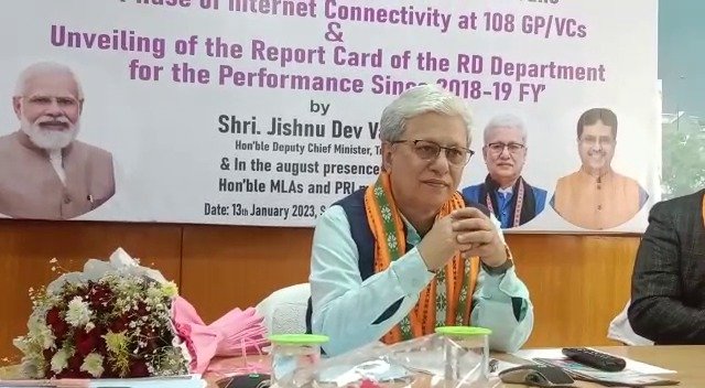 স্যন্দন ডিজিটাল ডেস্ক। আগরতলা। ১৩ জানুয়ারি :  শুক্রবার মহাকরণে ভার্চুয়াল মাধ্যমে ১৫ টি নতুন পঞ্চায়েত ভবন এবং প্রথম ধাপে ১০৮ টি গ্রাম পঞ্চায়েত তথা ভিলেজ কমিটিতে বিএসএনএলের মাধ্যমে নতুন ইন্টারনেট সংযুক্তির আনুষ্ঠানিক উদ্বোধন করেন উপমুখ্যমন্ত্রী তথা পঞ্চায়েত মন্ত্রী যীষ্ণু দেববর্মা। গ্রামীন এলাকার নাগরিক পরিষেবা প্রদানের লক্ষ্যে এই ভবনটি সবথেকে বেশি গুরুত্বপূর্ণ ভূমিকা নিয়ে থাকে। ২০২০-২১  সালে ১৫ টি এবং ২০২১- ২২ সালে ২৯ টি পঞ্চায়েত ভবন ত্রিপুরার জন্য বরাদ্দ করে কেন্দ্রীয় সরকার।