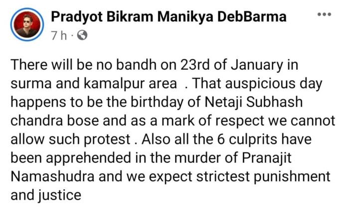 স্যন্দন ডিজিটাল ডেস্ক। আগরতলা। ২২ জানুয়ারি : ২৩ শে জানুয়ারি কমলপুর মহকুমা ১২ ঘন্টার বনধ অবশেষে প্রত্যাহার করল দলের সুপ্রিমো প্রদ্যোত কিশোর দেববর্মণ। রবিবার সামাজিক মাধ্যমে এসে এ বিষয়ে ঘোষণা দেন তিনি। সামাজিক মাধ্যমে প্রদ্যোত কিশোর দেববর্মণ লিখেছেন ২৩ শে জানুয়ারি নেতাজি সুভাষচন্দ্র বসুর জন্মদিন। তাই এ শুভদিনে কমলপুর মহকুমা সুরমা বিধানসভা কেন্দ্র এবং কমলপুর বিধানসভা কেন্দ্র ১২ ঘন্টার বনধ থাকবে না। এবং ঘটনার সুষ্ঠু তদন্ত করে দোষীদের শাস্তি দাবি জানান প্রদ্যোত।