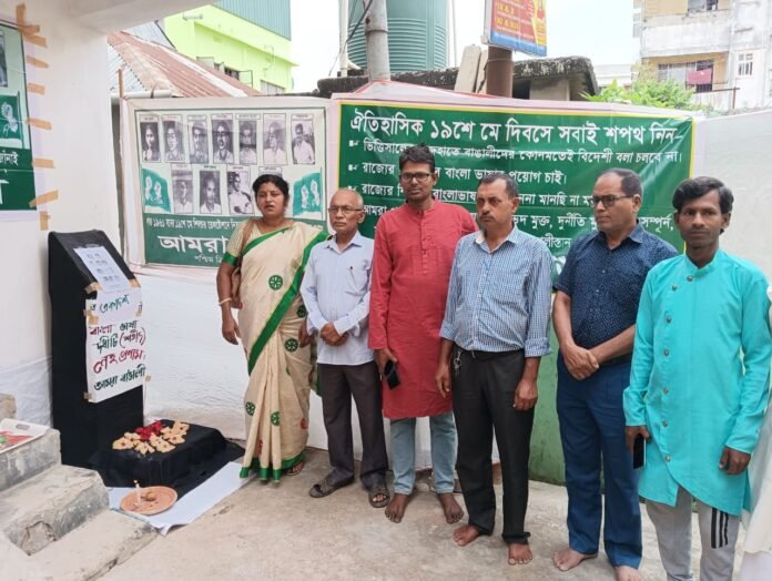 স্যন্দন ডিজিটাল ডেস্ক। আগরতলা। ১৯ মে : ১৯৬১ সালে ১৯ মে শিলচর রেল স্টেশনে ১১ জন বাঙালিকে বাংলা ভাষার জন্য শহীদ হতে হয়েছিল।তাদের প্রতি শ্রদ্ধা জানিয়ে শুক্রবার সকালে আমরা বাঙালি রাজ্য কার্যালয়ের সামনে এক শ্রদ্ধা জ্ঞাপন অনুষ্ঠানের আয়োজন করা হয়। উপস্থিত ছিলেন সংগঠনের রাজ্য সম্পাদক গৌরাঙ্গ রুদ্রপাল। সংগঠনের পরিভাষায় শহীদদের প্রতি পুষ্পার্ঘ্য অর্পণ করে শ্রদ্ধা জ্ঞাপন করা হয়।