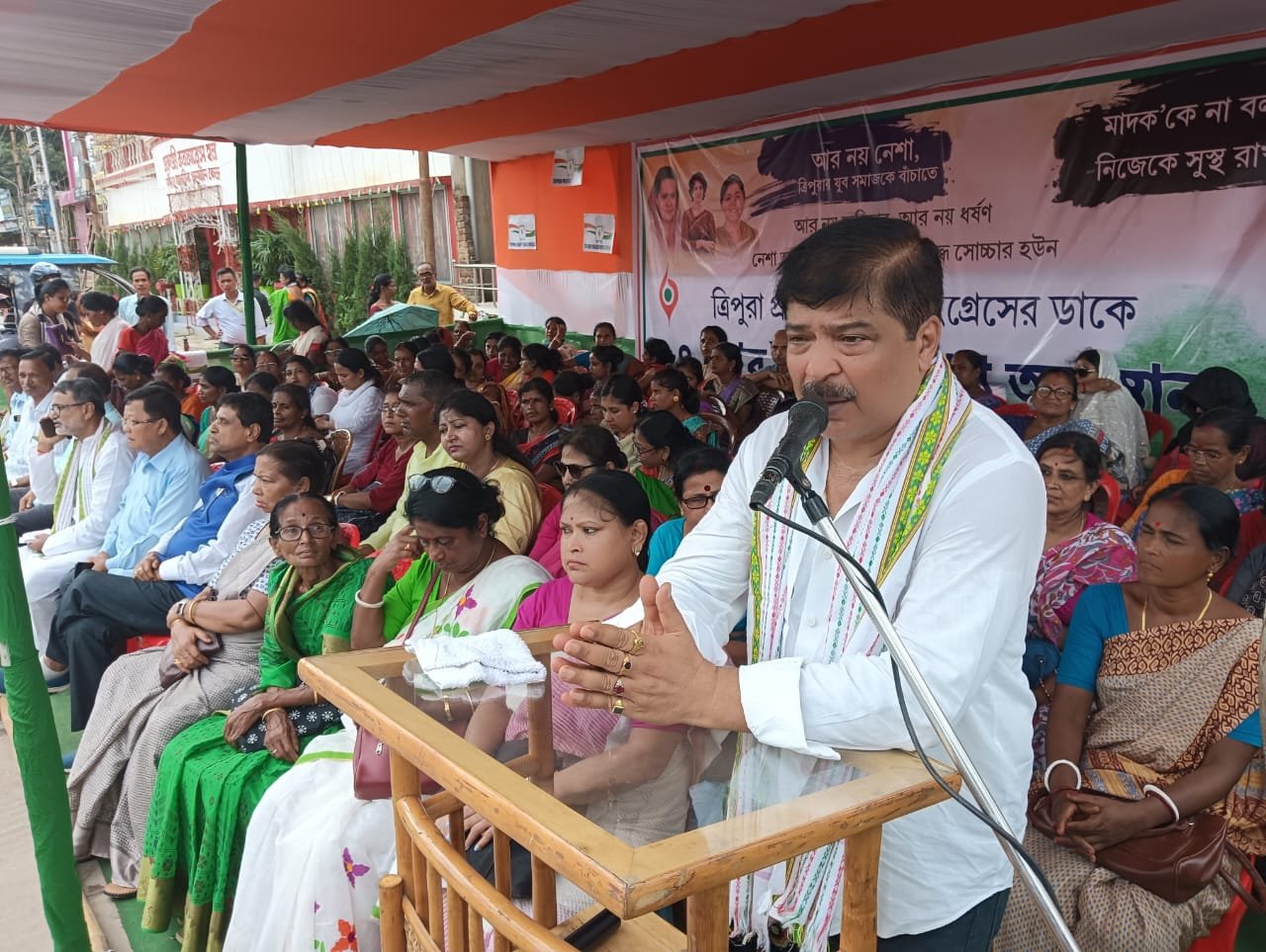 সোমবার প্রদেশ মহিলা কংগ্রেসের পক্ষ থেকে রাজধানীর অরিয়েন্ট চৌমহনি এলাকায় চার ঘন্টার গণ অবস্থানে উপস্থিত হয়ে এই কথা বলেন প্রদেশ কংগ্রেস সভাপতি আশীষ কুমার সাহা। তিনি বলেন কংগ্রেস রাজ্যের বিরোধীদল হিসেবে নেশার বিরুদ্ধে সোচ্চার হতে রাজ্যের মানুষকে অবগত করতে চায়। এবং বিরোধী দল হিসেবে সরকারকে জাগ্রত করে নেশা সাম্রাজ্য রুখতে চায়। সরকার যদি ভূমিকা না নেয় তাহলে রাজ্যের সব অংশের মানুষকে এগিয়ে এসে প্রতিবাদ এবং প্রতিরোধ গড়ে তোলা খুব জরুরি। এবং অপরদিকে শাসকদলে মদতপুষ্টদের দ্বারা নারীদের উপর অন্যায় অবিচার চলছে। ২০১৮ সালে রাজ্যে বর্তমান সরকার প্রতিষ্ঠিত হওয়ার পর নারী নির্যাতন বেড়েছে।