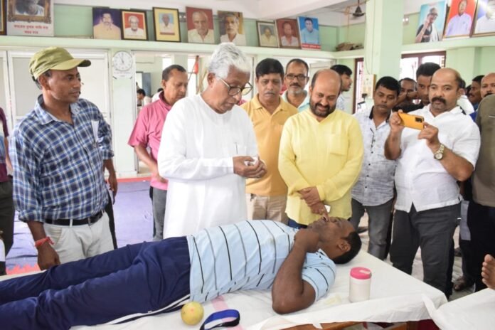 যারা রক্ত পাচ্ছে না তারা ভীষণ সমস্যায় পড়ে যাচ্ছে। এর থেকে যেটা মনে হচ্ছে সরকারের পক্ষ থেকে রক্তের জোগান নিশ্চিত করতে থেকে রক্তদানের উদ্যোগ গ্রহণ করা প্রয়োজন। কারণ সরকারি কর্মচারীদের দিয়ে যদি রক্তদান করা না গেলে রক্ত সংকটের সমস্যা সমাধান হবে না। তিনি বলেন, রাজ্যের হাসপাতাল গুলি ভালো চলছে না। পরিষেবার ক্ষেত্রে দিন দিন নিচের দিকে নেমে যাচ্ছে। কারণ হাসপাতালের সিনিয়র ডক্টররা রোগীদের সরাসরি দেখভাল করছেন না। এমবিবিএস ডিগ্রি অর্জন করার পর ইন্টান ছেলেমেয়েদের দ্বারা হাসপাতালগুলি চালানো হচ্ছে। তারা একদিকে যেমন ১২ ঘন্টা দায়িত্ব পালন করছে, অপরদিকে তাদের ছুটি নেই। এক প্রকার ভাবে তারা চরম অব্যবস্থার মধ্যে দিয়ে সীমাবদ্ধ অভিজ্ঞতাতে দায়িত্ব পালন করছেন। এতে রাজ্যের জিবি, আইজিএম হাসপাতাল সহ বিভিন্ন হাসপাতালে স্বাস্থ্য পরিষেবা বিঘ্নিত হচ্ছে। প্রাক্তন মুখ্যমন্ত্রী প্রশ্ন তুলে বলেন কিসের ভিত্তিতে রাজ্যের স্বাস্থ্য ব্যবস্থার বিশেষ উন্নতি ও অগ্রগতি হচ্ছে সেটা নজরে আসছে না। কারণ সরকারের বক্তব্যের সাথে বাস্তব অভিজ্ঞতার কোন মিল নেই। তারপরও সরকার যদি এ ধরনের সংগতিহীন বক্তব্য করে তাহলে এই সরকারের বিরুদ্ধে মানুষের মধ্যে বিক্ষোভ আরও বেশি বাড়বে। এগুলো বন্ধ হওয়া উচিত। ডাক্তার, নার্সের ডিগ্রি নিয়ে ছেলেমেয়েরা বসে আছে। তাদের নিয়োগ করা প্রয়োজন। তিনি আরো বলেন, হাসপাতাল থেকে সব ওষুধ দেওয়া সম্ভব না হলেও কিছু ওষুধ রোগীদের দেওয়ার জন্য ব্যবস্থা নেওয়া দরকার। আর এইগুলি করা না গেলে সরকারের অস্তিত্বের ভিত্তি কি প্রশ্ন তুলেন? আরো বলেন স্বাস্থ্যের মতো শিক্ষা ক্ষেত্রেও সরকার অবহেলা করে চলেছে। অভিভাবকরা তাদের ছেলেমেয়েদের বিদ্যালয়ে পাঠাচ্ছে, অথচ পড়াশোনা ঠিকভাবে হচ্ছে না। সুতরাং শিক্ষার ক্ষেত্রও আক্রান্ত। তাই এর বিরুদ্ধে আন্দোলন জারি রাখতে হবে বলে জানান তিনি। আয়োজিত রক্তদান শিবিরে এছাড়া উপস্থিত ছিলেন সি আই টি ইউ নেতা অমল চক্রবর্তী সহ অন্যান্যরা।
