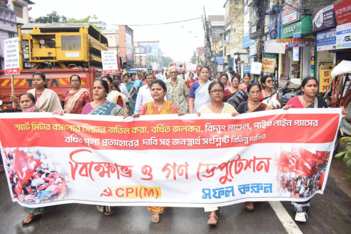 স্যন্দন ডিজিটাল ডেস্ক, আগরতলা, ১৯ জুলাই : বিদ্যুৎ মাশুল বৃদ্ধি করার পাশাপাশি সরকার জলের ও গ্যাসের মাশুল বৃদ্ধি করেছে। এর প্রতিবাদে শনিবার আগরতলা শহরে বিক্ষোভ মিছিল সংঘটিত করে জল বোর্ড অফিসের সামনে গিয়ে বিক্ষোভ কর্মসূচি সংঘটিত করে সিপিআইএম। মিছিলটি শুরু হয়েছিল মেলার মাঠ এলাকায় থেকে। শহরের বিভিন্ন পথ পরিক্রমা করে এই বিক্ষোভ কর্মসূচিতে সামিল হয় সিপিআইএম কর্মী সমর্থকরা। উপস্থিত ছিলেন প্রাক্তন মন্ত্রী তথা সিপিআইএম নেতা মানিক দে, অমল চক্রবর্তী সহ অন্যান্য নেতৃত্ব। প্রাক্তন মন্ত্রী মানিক দে জল বোর্ড অফিসের সামনে বিক্ষোভ সভায় সরকারের বিরুদ্ধে তীব্র সমালোচনা করতে গিয়ে বক্তব্য রেখে বলেন, বর্তমান সরকার নতুন কোন জলের প্লান্টের ব্যবস্থা না করে আচমটাই বিদ্যুৎ ও পাইপলাইন গ্যাসের পাশাপাশি জলের মাশুল বৃদ্ধি করেছে।