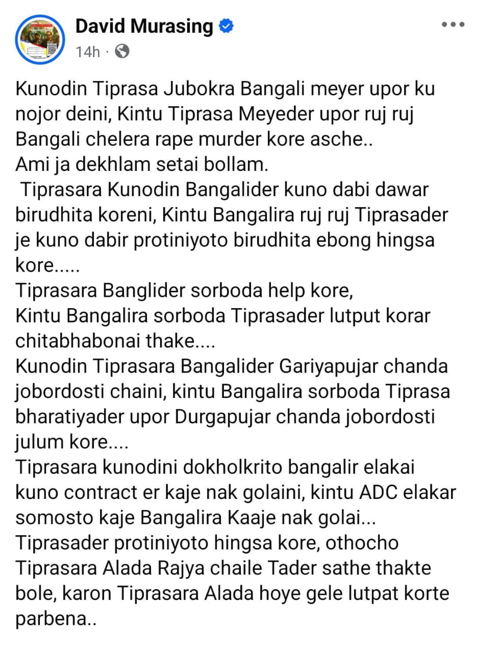 তৃতীয়তঃ তিপ্রসা বাঙ্গালীদের সব সময় সহযোগিতা করে, কিন্তু বাঙালিরা সর্বদা তিপ্রসাদের লুটপাট করার চিন্তা ভাবনায় থাকে। চতুর্থ কোনদিন তিপ্রসারা গড়িয়া পূজার চাঁদা নিয়ে জোর জবরদস্তি করেনি। অথচ বাঙালিরা তিপ্রসাদের উপর দুর্গাপূজার চাঁদার জবরদস্তি জুলুম করে। তারপরে আরো লিখেছেন, তিপ্রসা কোনদিন বাঙালির দখলকৃত এলাকায় কোন ঠিকাদারি কাজে নাক গলায় না, অথচ বাঙালিরা এডিসি এলাকায় সমস্ত কাজে নাক গলায়। তিপ্রসা পৃথক রাজ্য দাবি করলে তাদের সঙ্গে থাকার জন্য দাবি করে বাঙালিরা। কারণ তিপ্রসারা আলাদা হয়ে গেলে লুটপাট করতে পারবে না। সর্বশেষ লিখেছেন সাম্প্রদায়িক কারা?” এমন ধরনের মন্তব্য পোস্ট করেছেন তথাকথিত নেতা ডেভিড মুড়া সিং। ওনার পোস্টে স্পষ্ট হয়ে গেছে রাজ্যের শান্তি সম্প্রীতি এবং জাতি জনজাতির সুভ্রাতৃত্ব আর সহ্য হচ্ছে না উনার মতো প্রথম সারির কিছু নেতার। খবর লেখার ১৫ ঘণ্টা পরেও দলের পক্ষ থেকে এ বিষয় নিয়ে কোনরকম শব্দ উচ্চারণ হয়নি। এমনকি দলীয়ভাবে এর কোন প্রতিবাদ নেই রাজ্যে। সামাজিক মাধ্যমে বহাল রয়েছে ওনার বিতর্কিত পোস্ট।