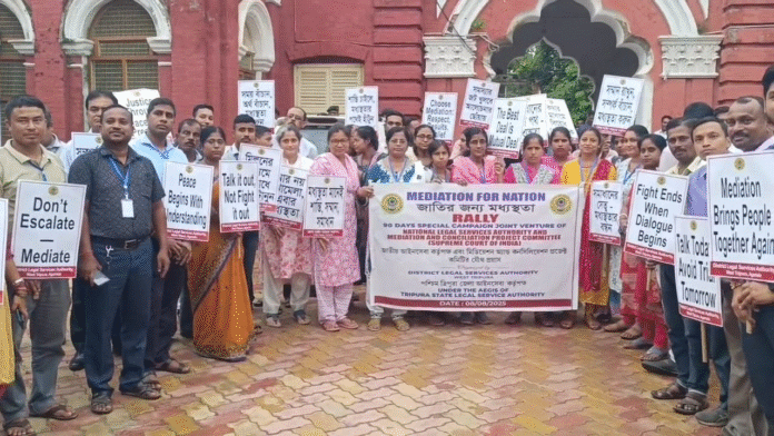 যা আগরতলা আদালত চত্বর থেকে শুরু হয়ে শহরের বিভিন্ন পথ পরিক্রমা করে । র‍্যালিতে পশ্চিম জেলার জেলা ও দায়রা বিচারক শুভাশিস শর্মা রায়, পারিবারিক আদালতের বিচারক হৃষীকেশ চক্রবর্তী , রাজ্য আইনসেবা কর্তৃপক্ষের সদস্য সচিব ঝুমা দত্ত চৌধুরী ,  সিজেএম সৈকত দাস ছাড়াও অন্যান্য বিচারকরা অংশ নেন। এছাড়াও আইনজীবী, আদালত কর্মী ,অধিকার মিত্ররা র‍্যালিতে হাঁটেন। উল্লেখ্য, দেশব্যাপী গত ১ জুলাই থেকে শুরু হয় এই কর্মসূচি। যা চলবে আগামী ৩০  সেপ্টেম্বর পর্যন্ত।  রাজ্যে এই অভিযানে প্রায় ১ হাজার মামলা নিষ্পত্তির জন্য মিডিয়েশন কেন্দ্রগুলিতে পাঠানো হয়েছে। হাইকোর্ট ছাড়াও রাজ্যের সবকটি জেলায় একটি করে মিডিয়েশন সেন্টারে এই প্রক্রিয়া চলছে বলে জানান রাজ্য আইনসেবা কর্তৃপক্ষের সদস্য সচিব ঝুমা দত্ত চৌধুরী।