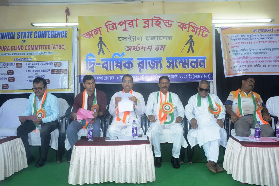 স্যন্দন ডিজিটাল ডেস্ক, আগরতলা। ১০ আগস্ট : রবিবার অল ত্রিপুরা ব্লাইন্ড কমিটি সেন্ট্রাল জোনের অষ্টাদশ তম দ্বিবার্ষিকী সম্মেলন অনুষ্ঠিত হয়। আগরতলা প্রেস ক্লাবে এই সম্মেলনের আয়োজন করা হয়। সম্মেলনে উপস্থিত ছিলেন সমাজকল্যাণ ও সমাজ শিক্ষা দপ্তরের মন্ত্রী টিংকু রায়, মৎস্য দপ্তরের মন্ত্রী সুধাংশু দাস, এ.টি.বি.সি -র সভাপতি ব্রজহরি দেবনাথ সহ অন্যান্যরা। প্রদীপ প্রজ্জ্বলন করে অনুষ্ঠানের উদ্বোধন করেন মন্ত্রী টিংকু রায়।