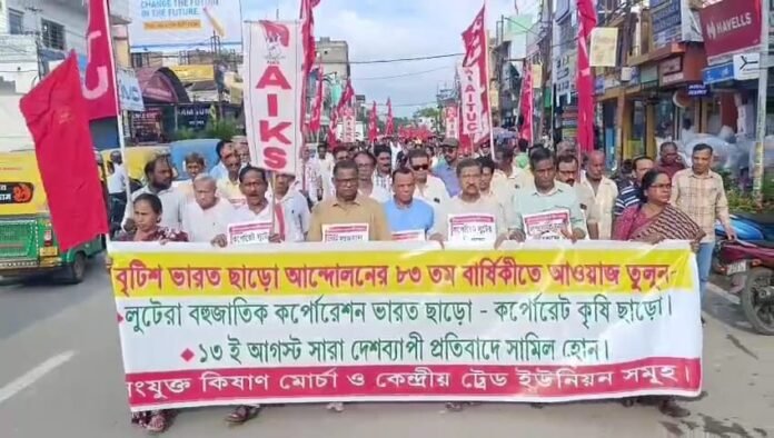 স্যন্দন ডিজিটাল ডেস্ক, আগরতলা, ১৩ আগস্ট : ব্রিটিশ ভারত ছাড়ো আন্দোলনের ৮৩ তম বার্ষিকীতে আন্দোলন গড়ে তুলেছে বামেরা। বুধবার সংযুক্ত কিষান মোর্চা ও কেন্দ্রীয় ট্রেড ইউনিয়ন যৌথভাবে আগরতলা শহরে বিক্ষোভ মিছিল করে দাবি করে লুটেরা বহুজাতিক কর্পোরেশন ভারত ছাড়ো- কর্পোরেট কৃষি ছাড়ো। মিছিলে উপস্থিত ছিলেন সংযুক্ত কিষান মোর্চার রাজ্য নেতৃত্ব পবিত্র কর, শংকর প্রসাদ দত্ত, ভানু লাল সাহা সহ অন্যান্যরা।