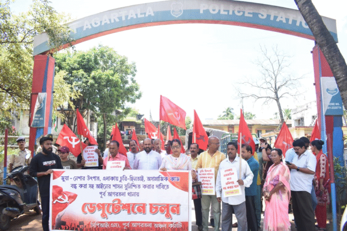 স্যন্দন ডিজিটাল ডেস্ক , আগরতলা। ১৯ আগস্ট : জুয়া, নেশার রমরমা বাণিজ্য, এলাকায় চুরি ছিনতাইর ঘটনা রুখতে এবং আইনের শাসন সুনিশ্চিত করার দাবিতে সরব হল সিপিআইএম পূর্ব আগরতলা অঞ্চল কমিটি। মঙ্গলবার সিপিআইএম পূর্ব আগরতলা অঞ্চল কমিটি ডেপুটেশান প্রদান করে পূর্ব আগরতলা থানায়। এইদিন সিপিআইএম পূর্ব আগরতলা অঞ্চল কমিটির সদস্য সদস্যারা মিছিল করে প্রথমে পূর্ব আগরতলা থানার সামনে যায়। সেখান থেকে এক প্রতিনিধি দল থানায় গিয়ে ওসির নিকট ডেপুটেশান প্রদান করে। প্রতিনিধি দলের নেতৃত্বে ছিলেন সিপিআইএম সদর মহকুমা কমিটির সম্পাদক অমল চক্রবর্তী।